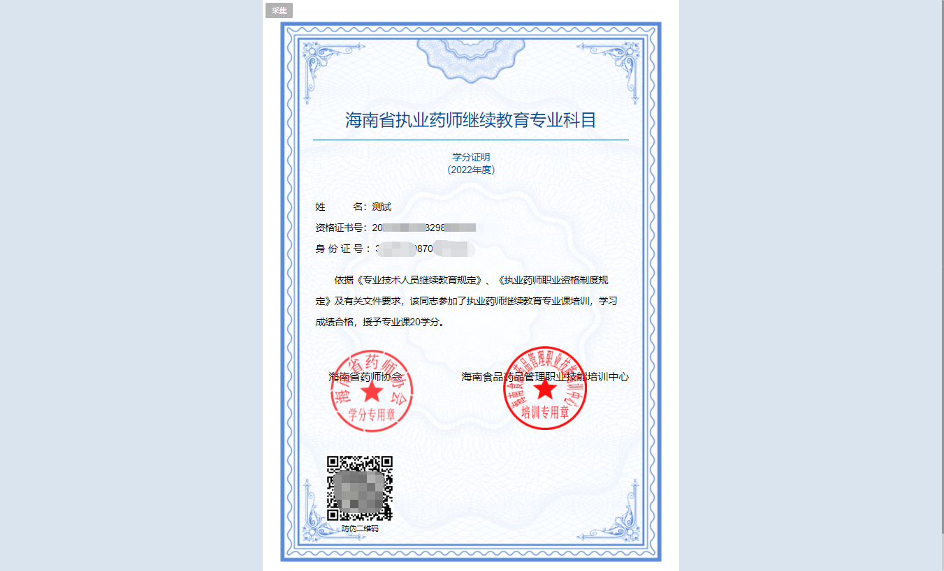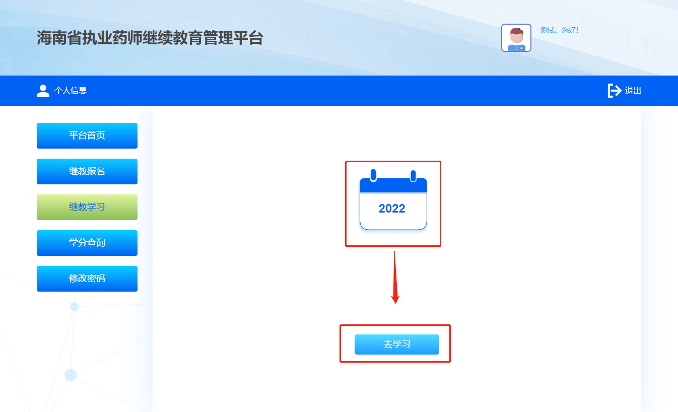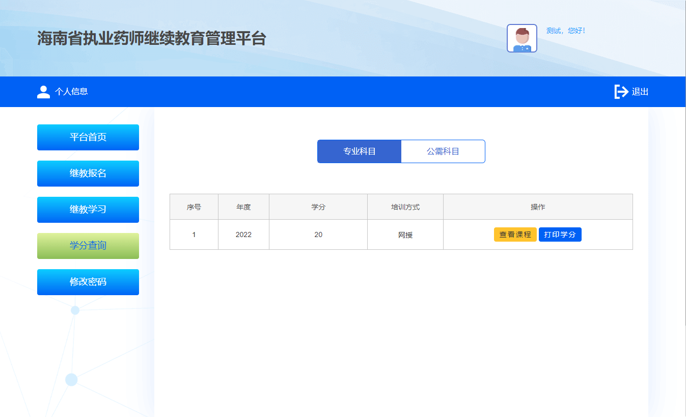 所有课程考试通过后,取得本年度学分。返回管理平台打印学分证明。
