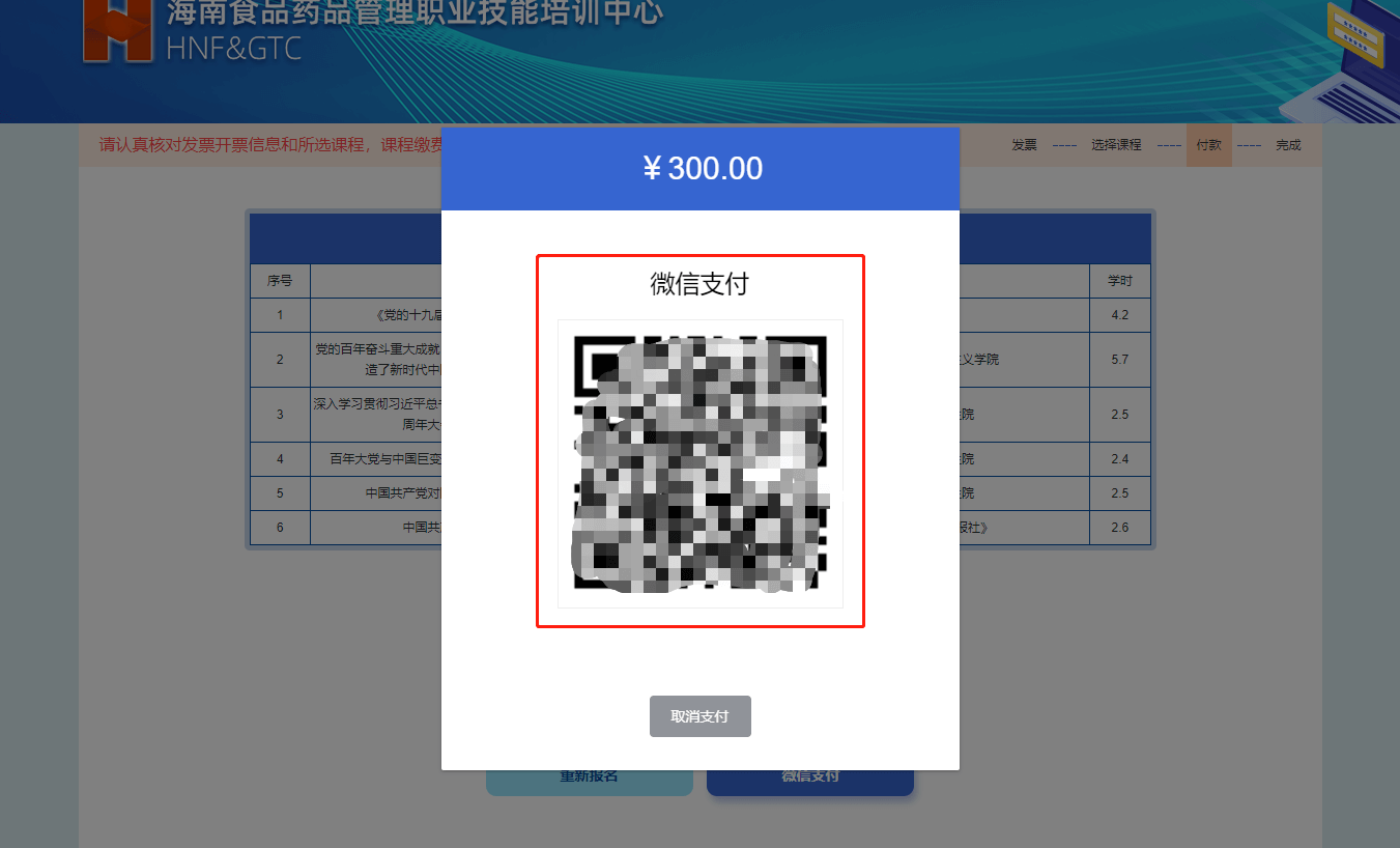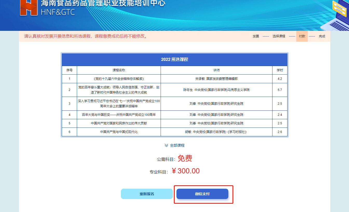 7、核对所选课程,确认后点击微信支付按钮,进行扫码支付。