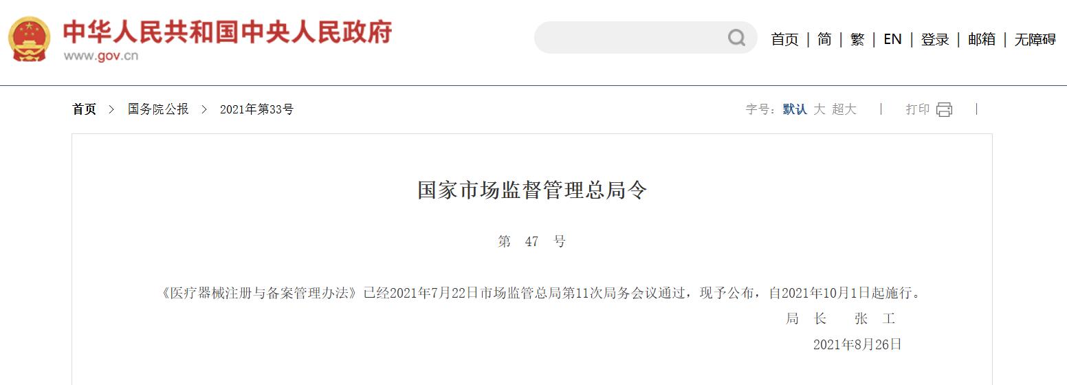 第一百二十四条 本办法自2021年10月1日起施行。2014年7月30日原国家食品药品监督管理总局令第4号公布的《医疗器械注册管理办法》同时废止。